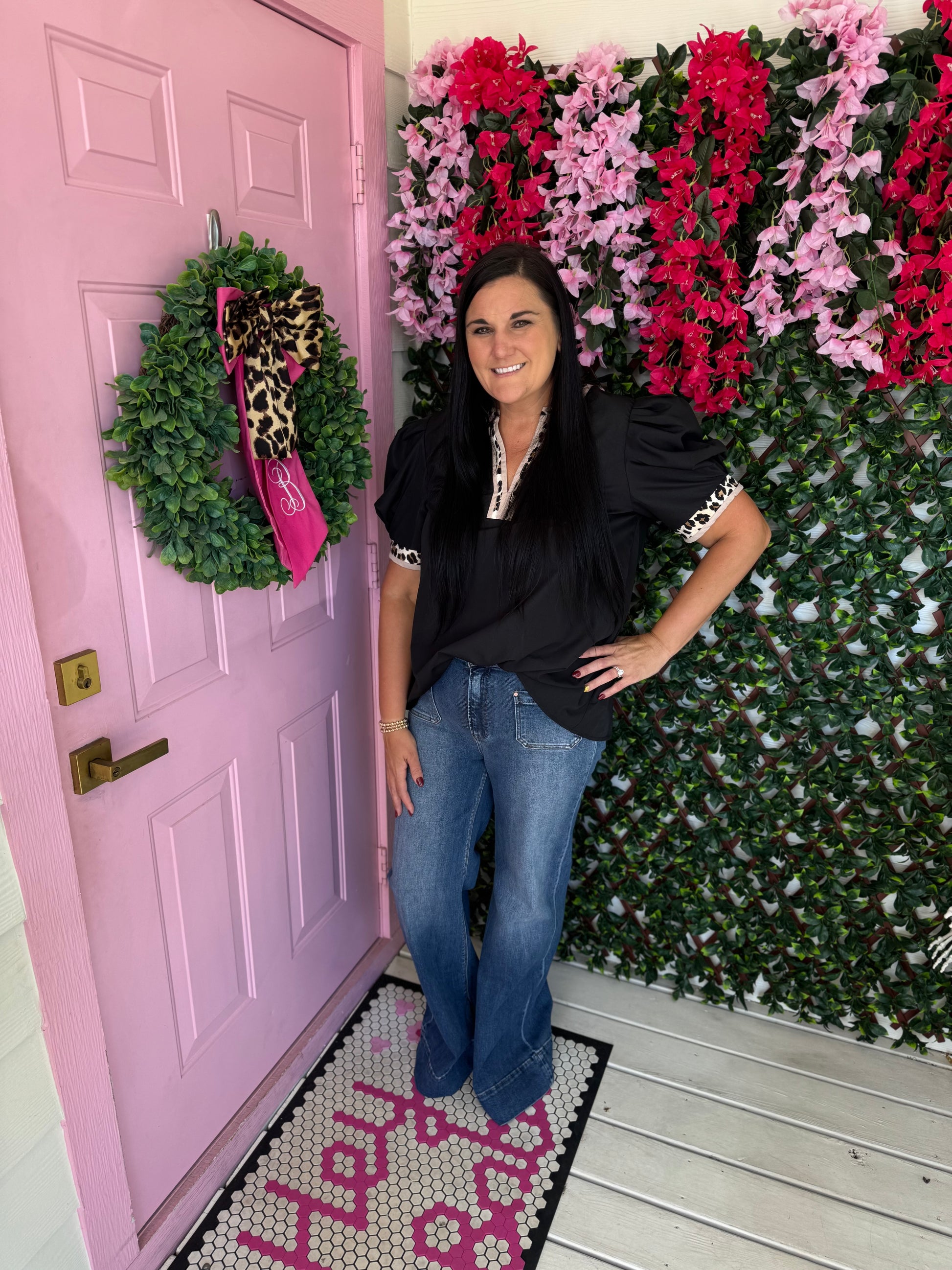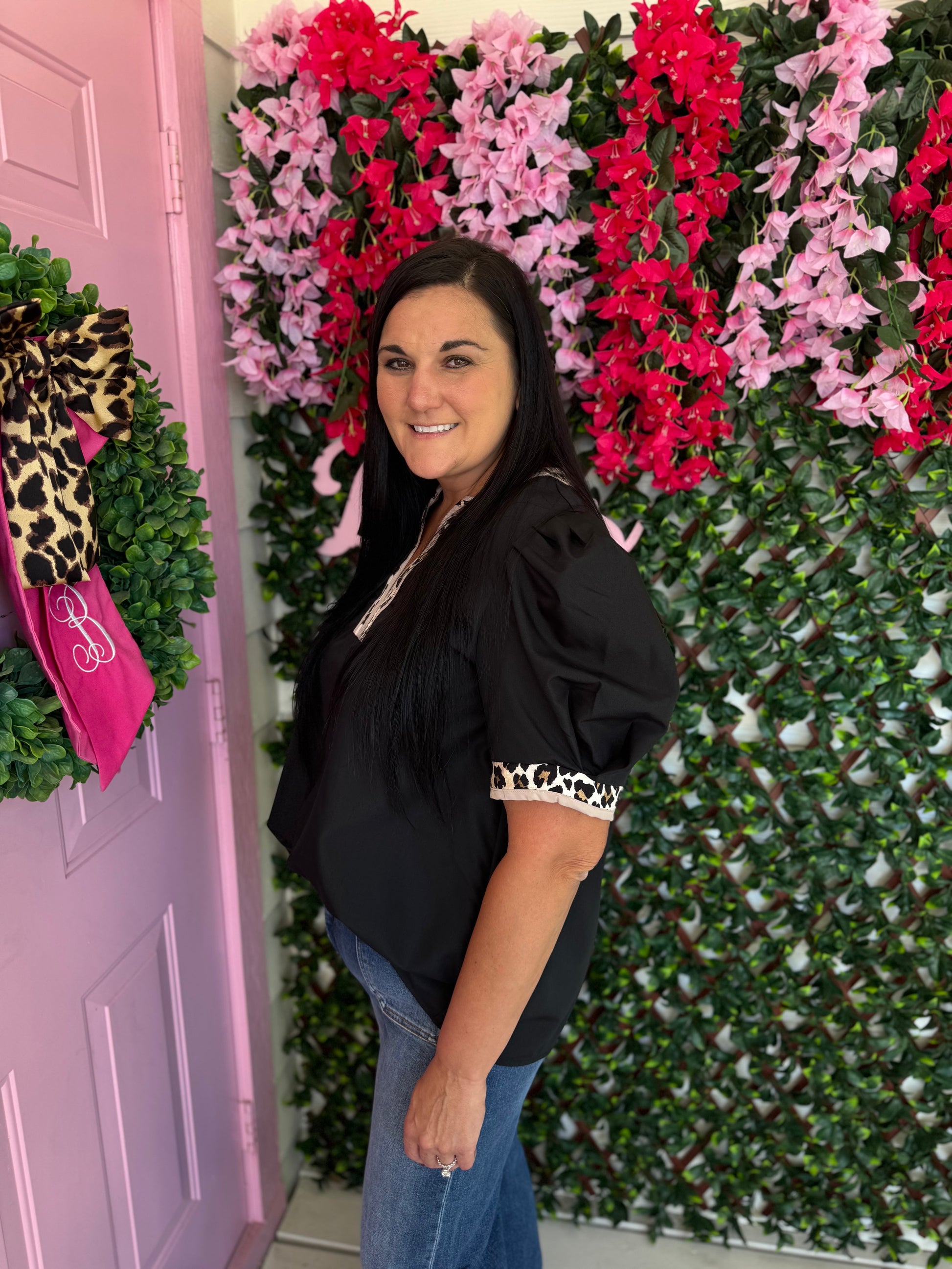 Black Leopard Trim Top- Plus