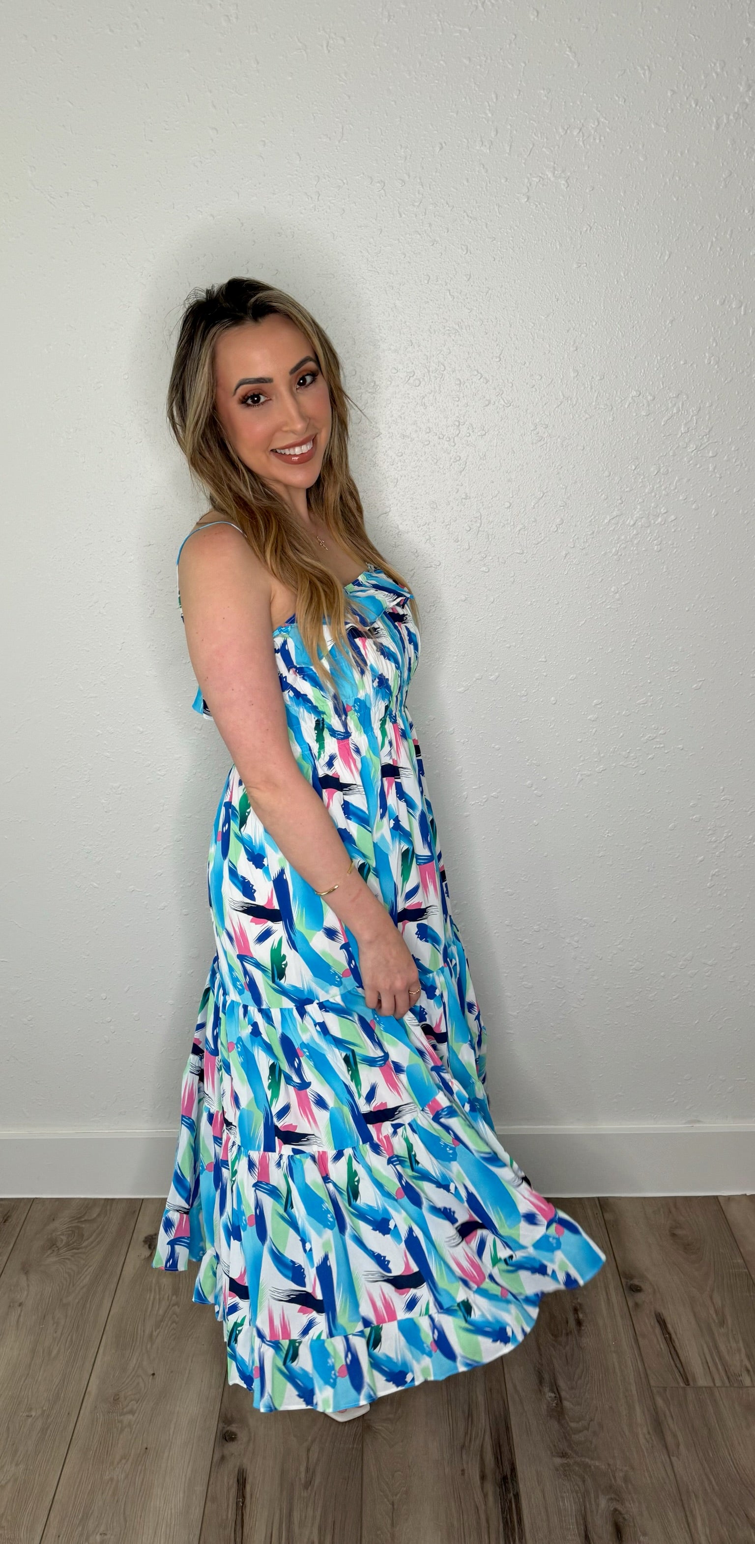 Ruffles and bright colors; what more could we ask for in a summer dress? This dress features adjustable straps and elastic waistband.
